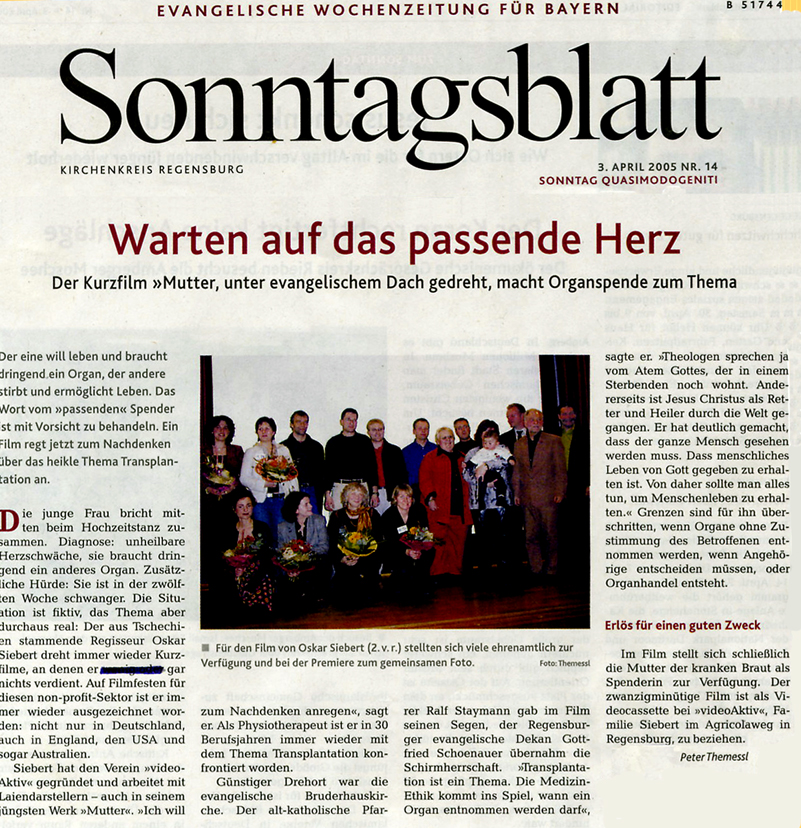 Mladá žena omdlí při svém svatebním tanci. Diagnóza: nevyléčitelná srdeční vada, žena potřebuje nutně nové srdce. Vše je ještě ztíženo tím, že je ve 12. týdnu těhotná. Situace je sice hraná, ale téma je reálné. Režisér a autor Oskar Siebert, točí krátké filmy na kterých bohužel nevydělává. Na festivalech neprofesionálních filmů získává řadu ocenění, ne jenom v Německu, ale též v Anglii, USA a dokonce i v Austrálii. Siebert založil tuto malou filmařskou skupinku „videoAktiv Regensburg“ a pracuje převážně s neprofesionálními herci, tak jako i v jeho nejnovějším filmu „MATKA“. „Já chci vyprovokovat k zamyšlení“, řekl mi. Jako fyzioterapeut byl Siebert za svých 30 let praxe s otázkou transplantací velice často konfrontován.